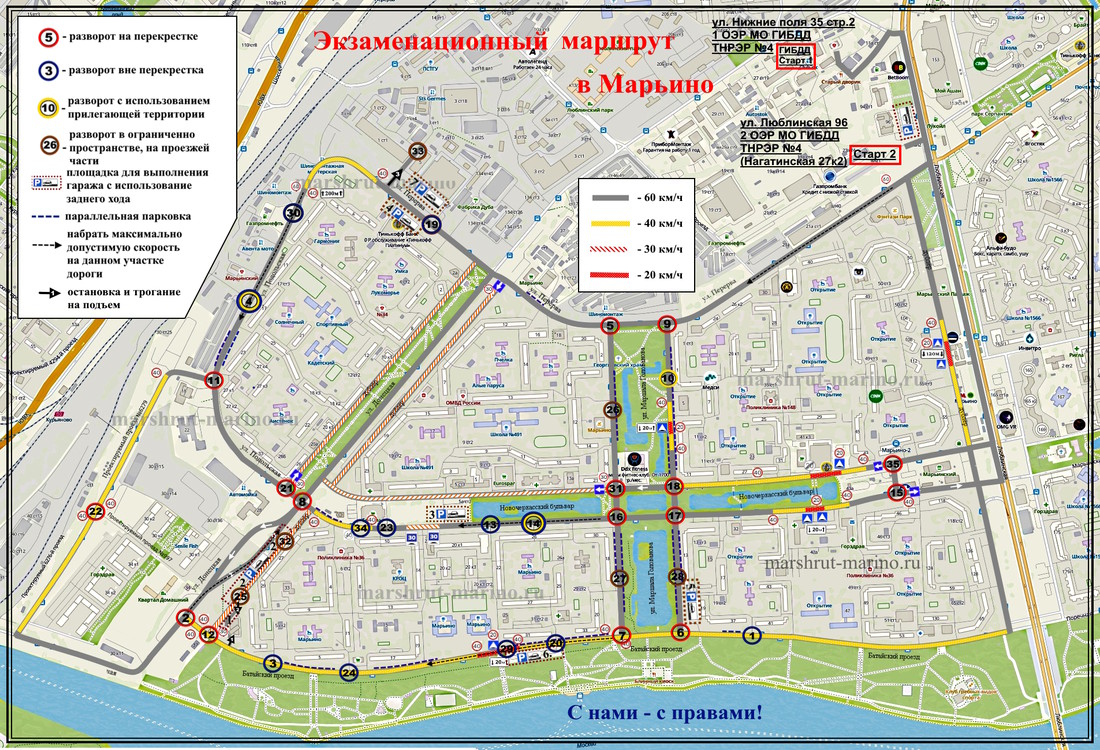 На карте доступны все развороты, набор максимальной допустимой скорости, которые практикуются на экзамене в ГИБДД Марьино.
